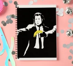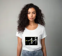 Questa iconica opera di Banksy parodia brillantemente la famosa scena del film Pulp Fiction. Sostituisce le pistole dei protagonisti con banane gialle e brillanti, trasformando un momento di estrema tensione in un momento umoristico. L'opera critica abilmente la violenza delle armi, celebrando al contempo la cultura pop e l'assurdo.