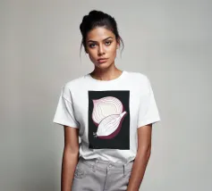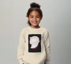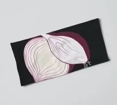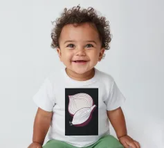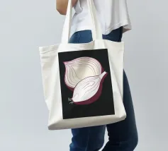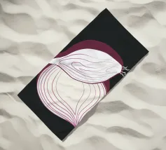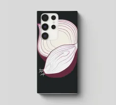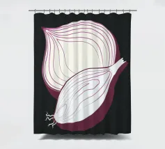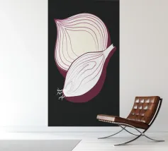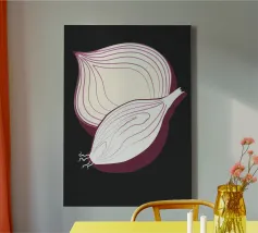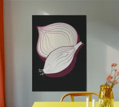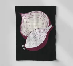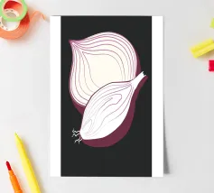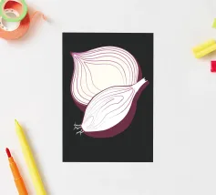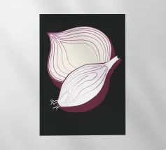 Una rappresentazione stilizzata mostra due metà di una cipolla rossa su uno sfondo scuro, evidenziando gli strati concentrici in viola e bianco. Il disegno enfatizza la semplicità e il contrasto.