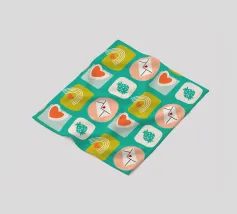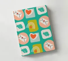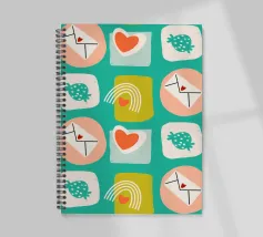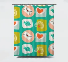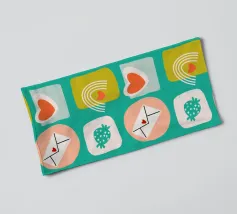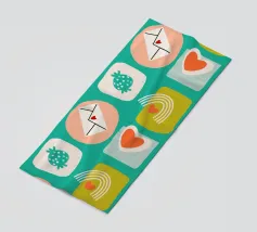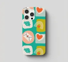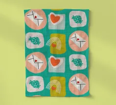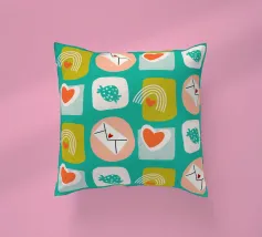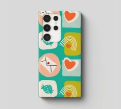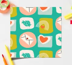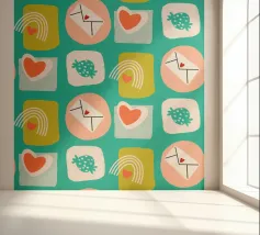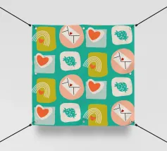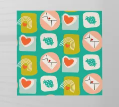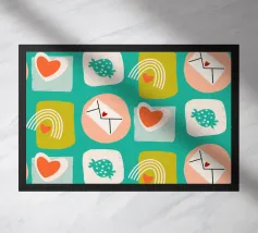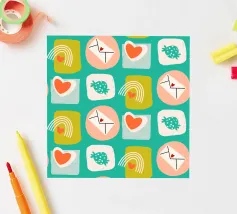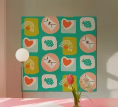 Date un tocco di fascino retrò ai vostri progetti con questo vivace disegno che presenta cuori giocosi, lettere d'amore, arcobaleni e fragole incorniciati da quadrati e cerchi astratti. Su un audace sfondo arancione, questo disegno ispirato alla metà del secolo scorso irradia energia e gioia.