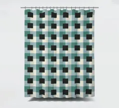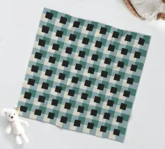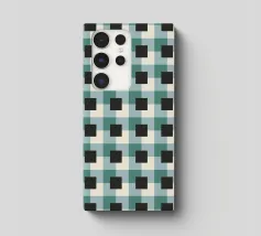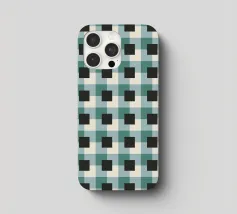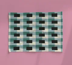 Un motivo a griglia composto da un'alternanza di quadrati neri e tonalità verdi crea un effetto ottico accattivante. Il disegno presenta una disposizione ripetitiva che gioca con la simmetria geometrica.