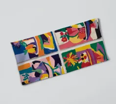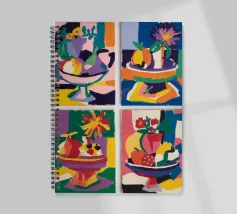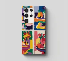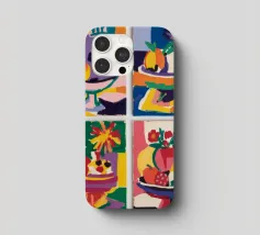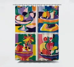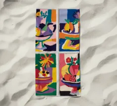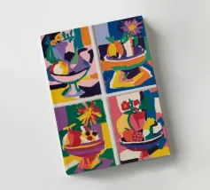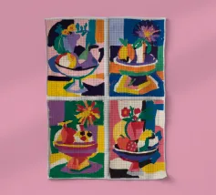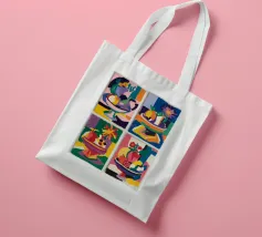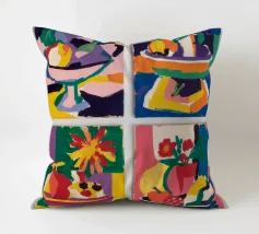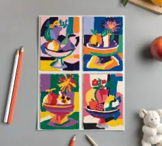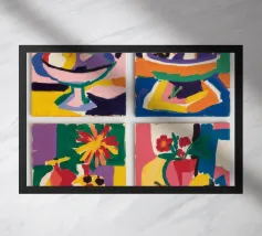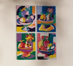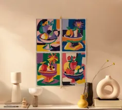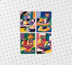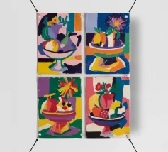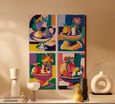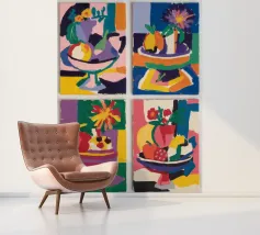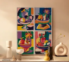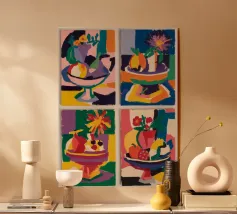 Una composizione divisa in quattro quadranti colorati, ognuno dei quali raffigura una diversa composizione di natura morta di frutta, vasi e brocche. Lo stile vibrante e colorato ricorda la pop art moderna o il fauvismo.