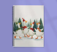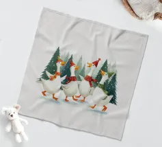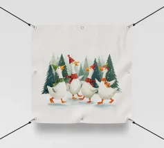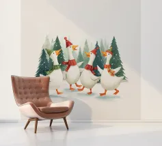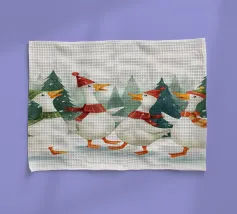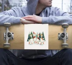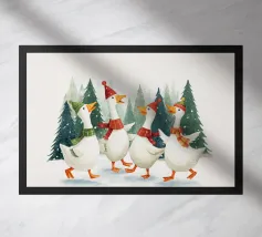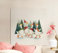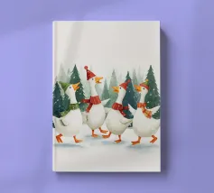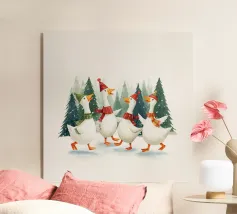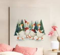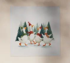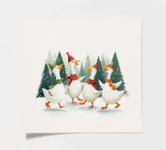 Questa festosa opera d'arte natalizia raffigura quattro giocose oche che indossano cappelli e sciarpe a maglia colorate e che danzano gioiosamente insieme in una foresta innevata di pini. Dipinto a mano in morbido acquerello, cattura lo spirito allegro degli animali del bosco in inverno. Perfetto per tessuti, carte da parati e accoglienti progetti stagionali, questo affascinante disegno aggiunge calore vintage e stravaganza alle tradizioni natalizie. Create da Uta Naumann, le oche portano la magia e l'allegria nostalgica delle feste, rendendole una scelta deliziosa per le celebrazioni festive, l'artigianato invernale e le decorazioni ispirate al bosco.