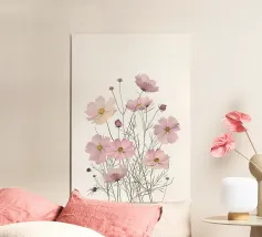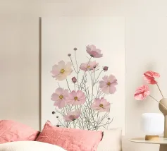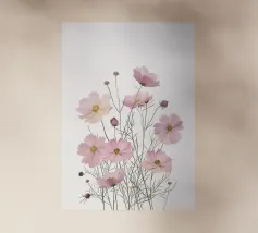 Delicati fiori di cosmo in rosa tenue e tonalità pastello fluttuano come in un prato estivo. Questo poster combina il minimalismo con l'eleganza floreale, perfetto per chi vuole portare naturalezza ed estetica nel proprio spazio vitale. Le linee sottili e i fiori trasparenti conferiscono leggerezza e creano una sensazione di calma e armonia.