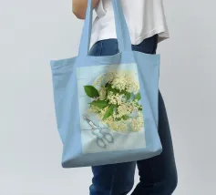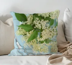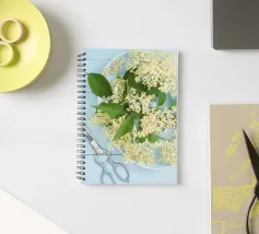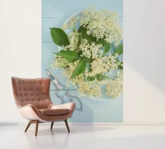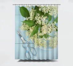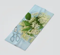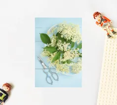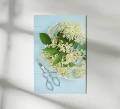 Fiori di sambuco appena raccolti con foglie verdi su un piatto, accompagnati da forbici da giardino vintage, su un tavolo rustico in legno blu.