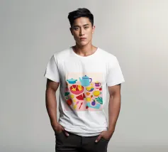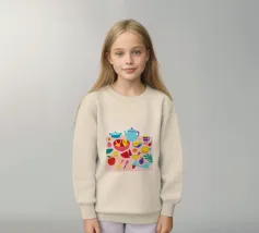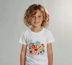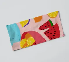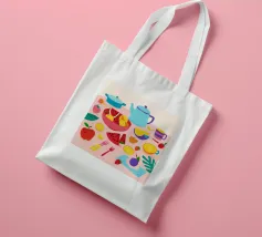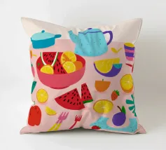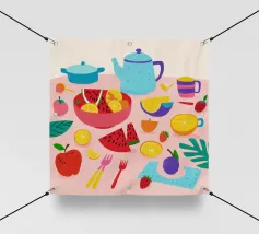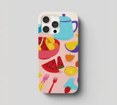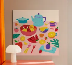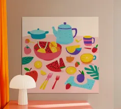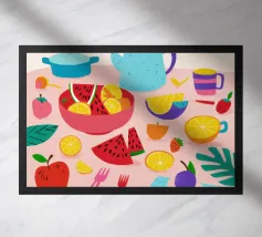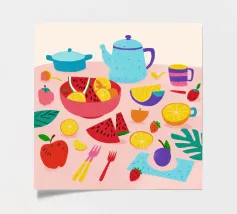 Un abbondante raccolto di frutta stilizzata, tra cui mele, angurie e limoni, è splendidamente disposto con una teiera blu, creando una ricca e colorata celebrazione della dolcezza della natura.