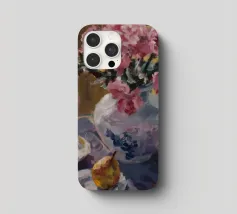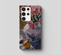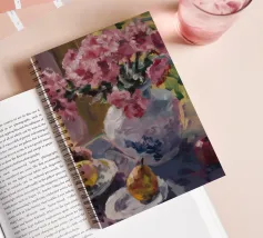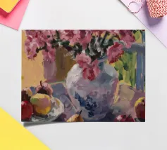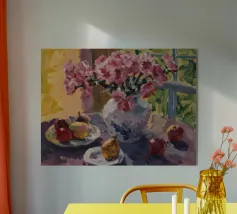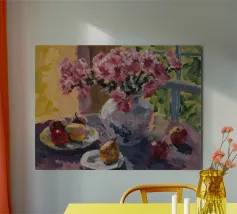 Una natura morta presenta un vivace bouquet di fiori rosa e rossi in un semplice vaso, accanto a mele sparse su una superficie, trasmettendo un senso di abbondanza autunnale e di fascino domestico.