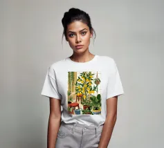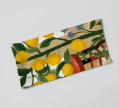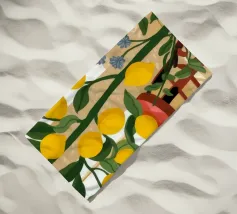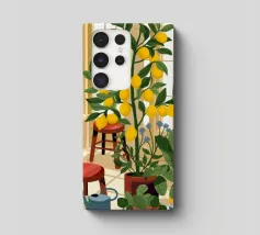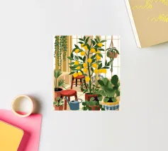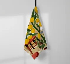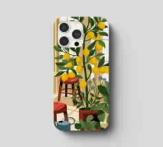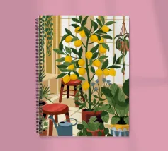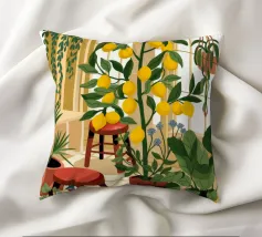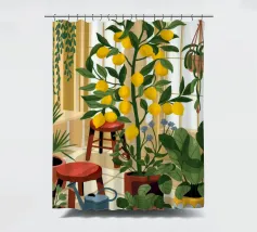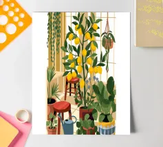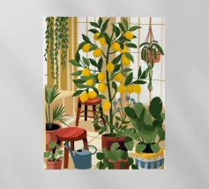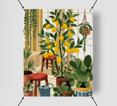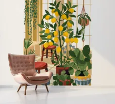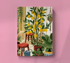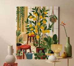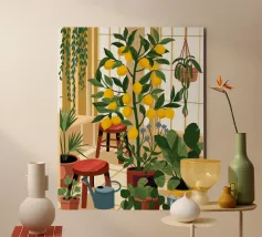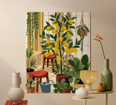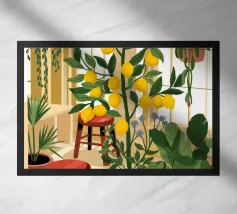 Quest'opera d'arte mostra una stanza vivace piena di alberi di limoni e di verde assortito. Il giallo intenso dei limoni crea un'atmosfera vivace e rinfrescante.