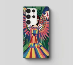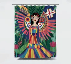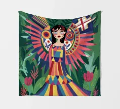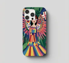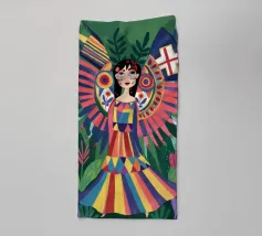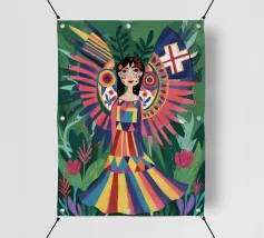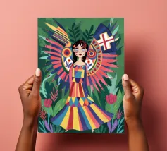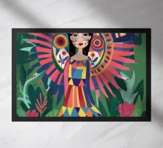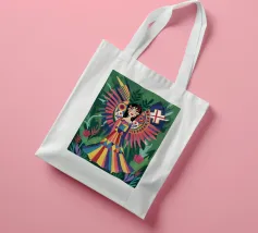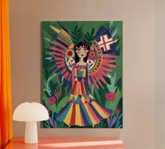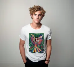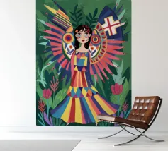 Una persona in abito colorato con ali si staglia su uno sfondo verde. Le ali e l'abbigliamento luminoso simboleggiano la libertà e l'espressione artistica.
