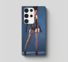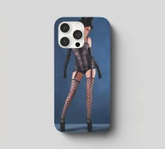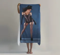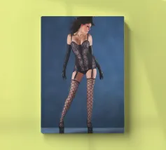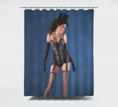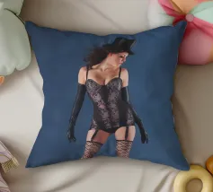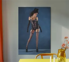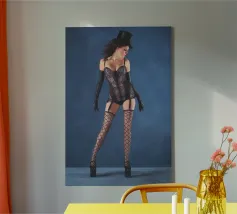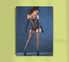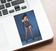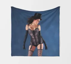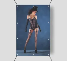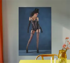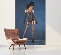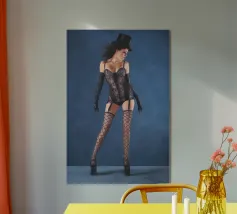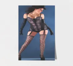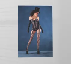 Uno scatto glamour di una giovane donna con cappello a cilindro, calze, reggicalze e lingerie