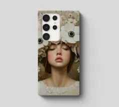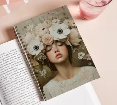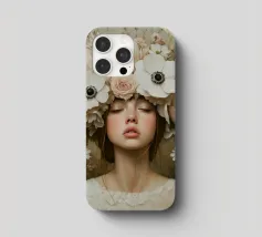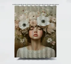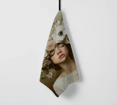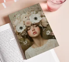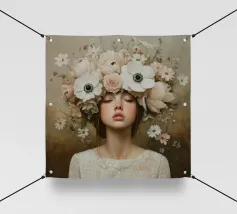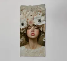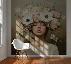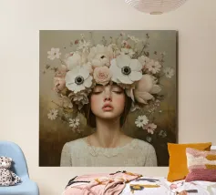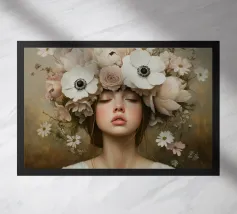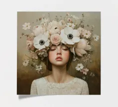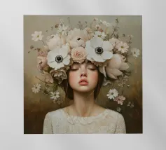 Un moderno collage di opere d'arte che fonde la fotografia con i toni morbidi e tenui del blush, del pastello e del marrone. Il ritratto raffigura una donna molto giovane adornata da delicati fiori sulla testa, che creano un aspetto etereo e naturale. Metà del viso è oscurata, aggiungendo mistero e profondità al ritratto. La sottile tavolozza di colori, con sfumature morbide e texture delicate, evoca tranquillità e femminilità. Questo pezzo contemporaneo combina il realismo con elementi astratti, offrendo una qualità serena e onirica che attira lo spettatore nella sua tranquilla bellezza.