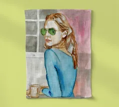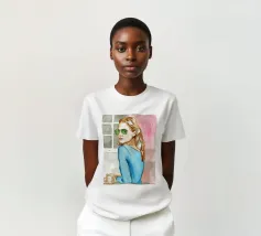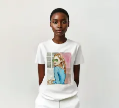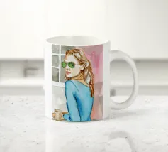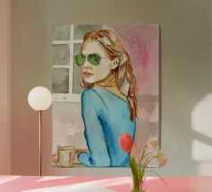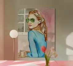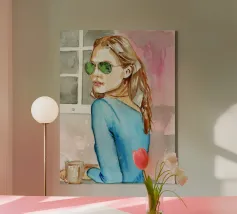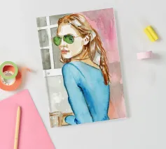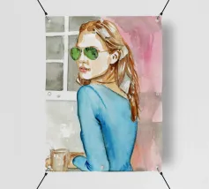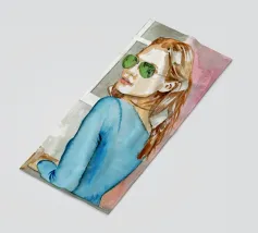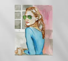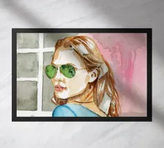 Grazioso ritratto di moda di una donna con occhiali da sole dipinto con acquerelli tradizionali. Lavaggi morbidi, linee fluide e tonalità delicate mettono in risalto l'eleganza e lo stile, fondendo la tecnica classica con l'estro moderno in una celebrazione senza tempo della bellezza femminile.