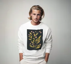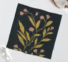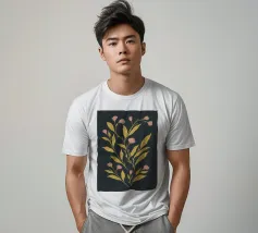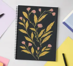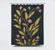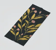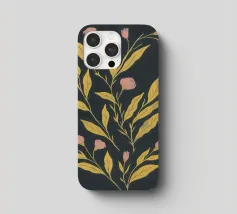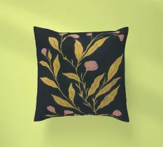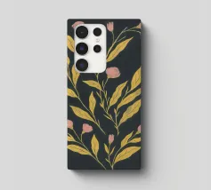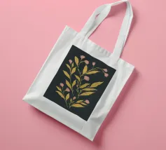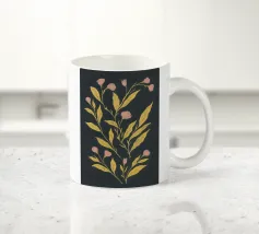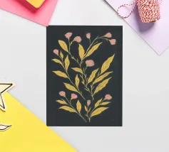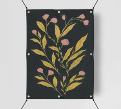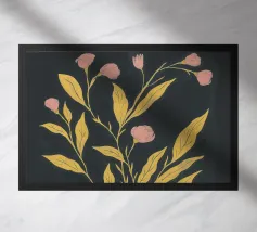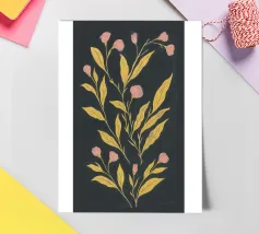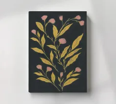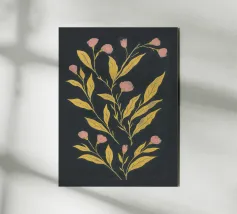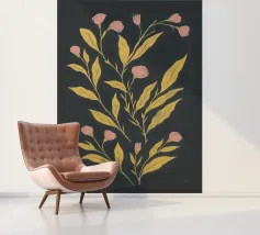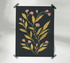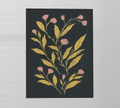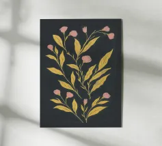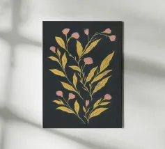Una delicata illustrazione botanica con foglie gialle e fiori rosa tenui su sfondo scuro. Minimalista ed elegante, dona un tocco calmo e decorativo a qualsiasi interno.