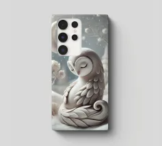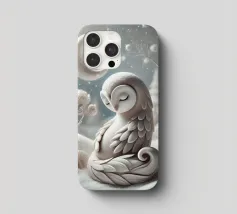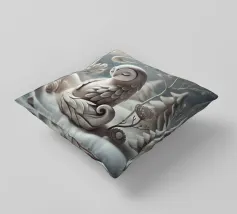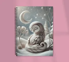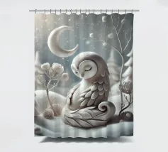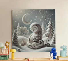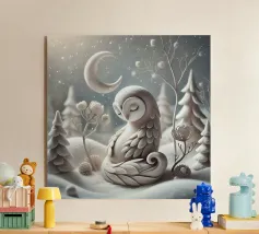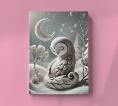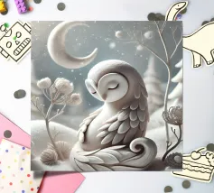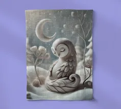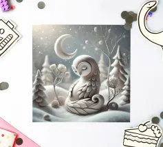 Un gufo Twiglet, con morbide piume bianche che ricordano delicati ramoscelli, se ne sta tranquillo in una foresta coperta di neve. L'aspetto etereo e quasi magico del gufo si fonde perfettamente con il paesaggio invernale, mentre i fiocchi di neve scivolano dolcemente intorno a lui. La luna, che risplende luminosa, proietta una luce morbida e argentea sulla scena, illuminando il gufo e gli alberi innevati. Nonostante il cielo notturno, la scena è pervasa da una pacifica luminosità, creando un'atmosfera serena e onirica nel cuore della foresta. Una perfetta cattura della tranquilla bellezza della natura al chiaro di luna".
