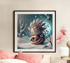Un gufo Twiglet, con morbide piume bianche che ricordano delicati ramoscelli, se ne sta tranquillo in una foresta coperta di neve. L'aspetto etereo e quasi magico del gufo si fonde perfettamente con il paesaggio invernale, mentre i fiocchi di neve scivolano dolcemente intorno a lui. La luna, che risplende luminosa, proietta una luce morbida e argentea sulla scena, illuminando il gufo e gli alberi innevati. Nonostante il cielo notturno, la scena è pervasa da una pacifica luminosità, creando un'atmosfera serena e onirica nel cuore della foresta. Una perfetta cattura della tranquilla bellezza della natura al chiaro di luna".