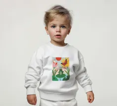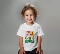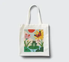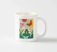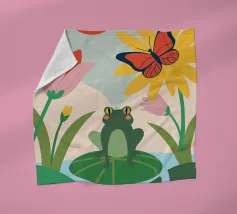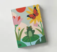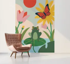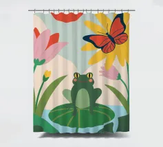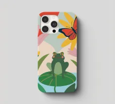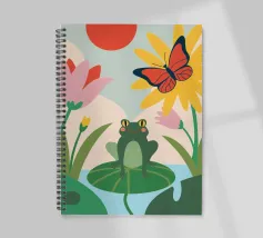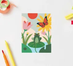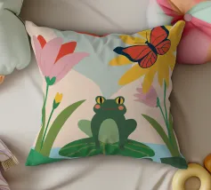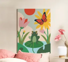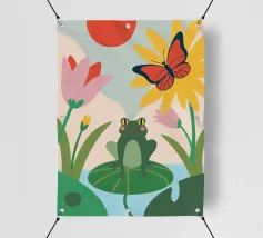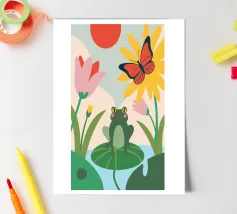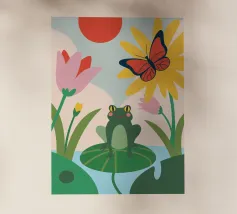 Questa illustrazione mostra gli splendidi dettagli di una serena rana verde in mezzo a un giardino fiorito punteggiato di farfalle colorate.