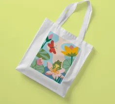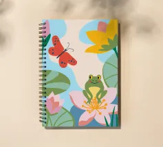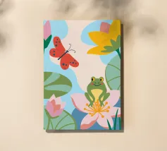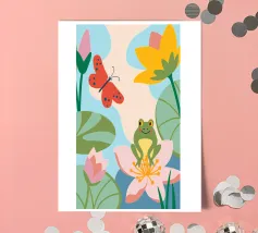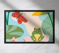 Questa illustrazione mostra gli splendidi dettagli di una serena rana verde in mezzo a un giardino fiorito punteggiato di farfalle colorate.