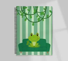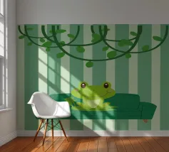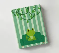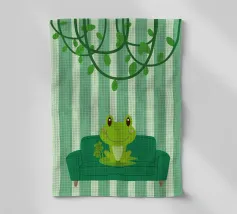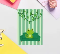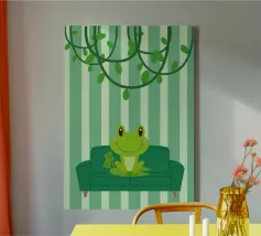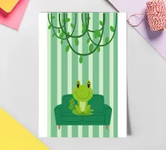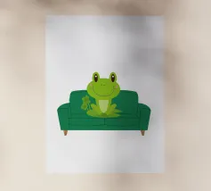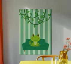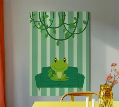 Poster Rana sul divano! Questa rana felice e rilassata si sta godendo un momento di riposo su un elegante divano verde sotto i rampicanti della giungla. Un'illustrazione meravigliosamente stravagante e carina, perfetta per una nursery moderna, una camera da letto per bambini o anche per uno spazio abitativo stravagante. Il tema della giungla/natura e i toni verdi brillanti conferiscono un'atmosfera allegra e tropicale. Un disegno perfetto per chi apprezza l'umorismo animale e l'arte murale di stile! Rana, rana verde, divano, giungla, rampicanti, natura, carino, stravagante, cameretta, stanza dei bambini, arredamento per la camera da letto, tropicale, umorismo animale, arte da parete, moderno, rilassato.