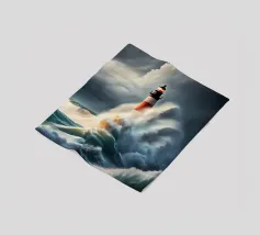 "Rough Sea" è un'opera d'arte digitale in potente computer grafica. Onde scroscianti, nuvole scure e spruzzi d'acqua riempiono l'immagine di energia e drammaticità. La tecnologia digitale enfatizza con precisione i dettagli più fini, come le strutture dell'acqua e i riflessi della luce. I forti contrasti e le forme dinamiche trasmettono la forza sfrenata della natura. "Rough Sea" simboleggia il movimento, il cambiamento e l'interazione tra minaccia e bellezza: un'opera moderna che mette in scena in modo impressionante la potenza del mare.