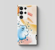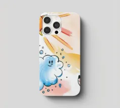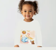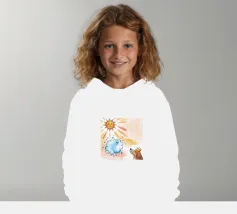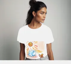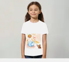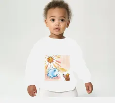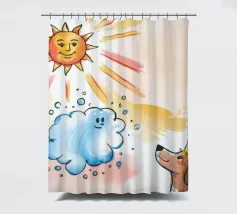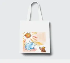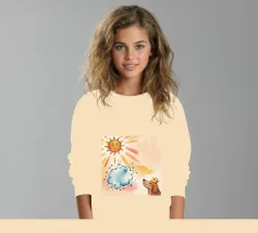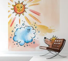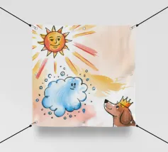 Un cane incoronato guarda verso l'alto una nuvola sorridente e un sole radioso. L'ambientazione immaginaria evoca un senso di fantasia, di festa e di calore sotto i raggi luminosi.