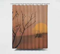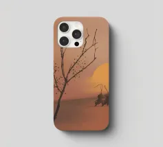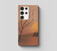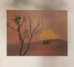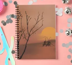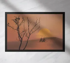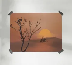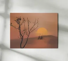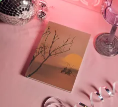 Le sagome di due figure che impugnano canne da pesca si stagliano su un tramonto caldo e luminoso su una dolce collina. In primo piano si trova un albero senza foglie, i cui rami si protendono verso il cielo in questa scena tranquilla.