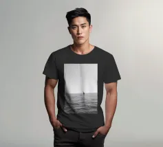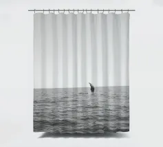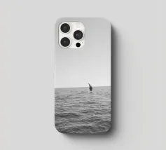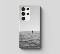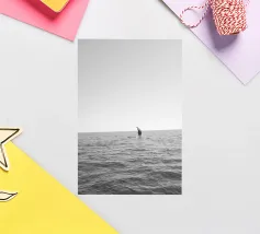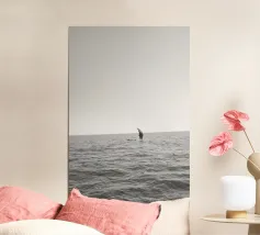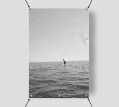 Un momento di calma in mare aperto: la pinna di una balena che emerge dall'acqua nel mezzo del vasto oceano. Semplice in bianco e nero. Tranquillità per ambienti minimalisti.