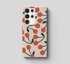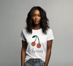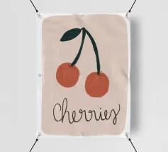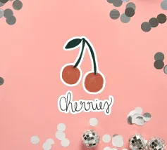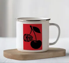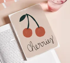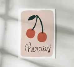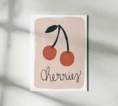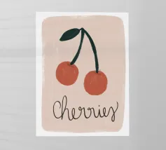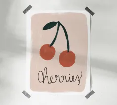 Un'illustrazione giocosa e minimalista con ciliegie rosse e un tocco di scrittura a mano. Semplice, fresca e piena di fascino, perfetta per aggiungere un tocco di colore a qualsiasi spazio.