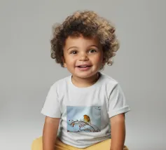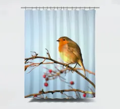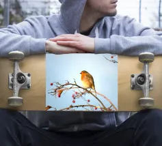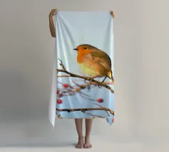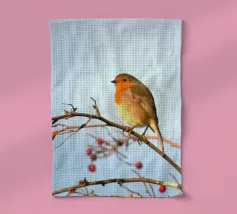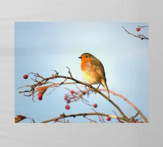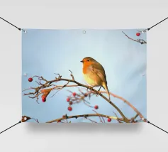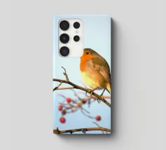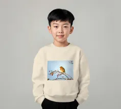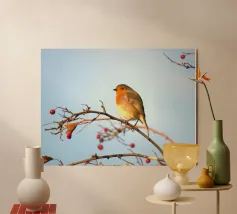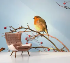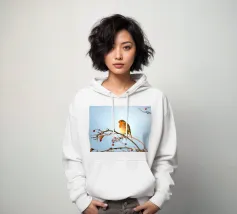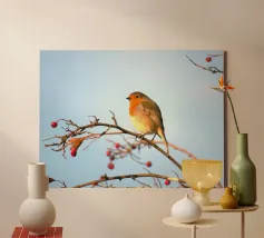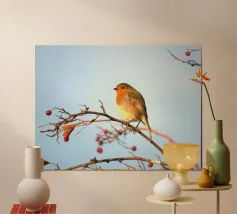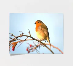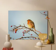 Il piccolo pettirosso, con il suo piumaggio grigio-marrone accentuato da un petto rosso vivo, spicca nello spazio. Si appollaia delicatamente su un ramo sottile, con le zampe aggraziate che si aggrappano saldamente. I suoi occhi neri scintillano, lo sguardo è distante come se affondasse in un cielo immenso, evocando una sensazione di dolcezza e di mistero.