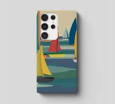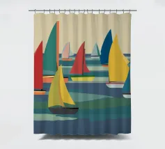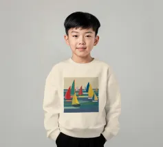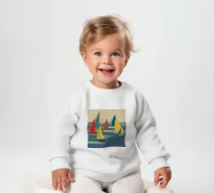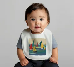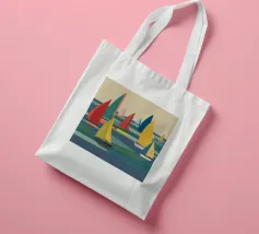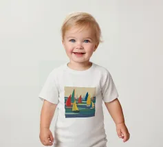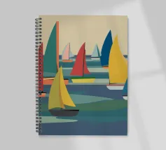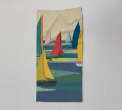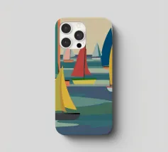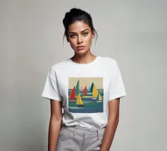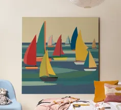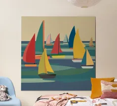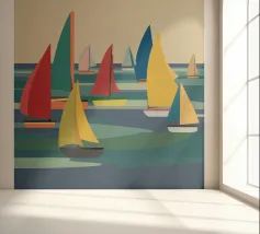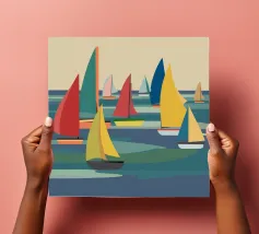 Una vibrante illustrazione grafica di una regata di barche a vela, con vele colorate su un mare blu e calmo. La composizione è allegra e moderna e cattura la sensazione gioiosa e ventilata di una giornata sull'acqua.