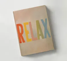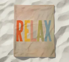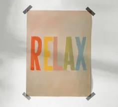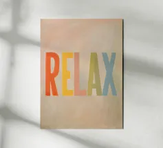 Motivo tipografico minimalista con la parola "Relax" in colori tenui e armoniosi su uno sfondo calmo e chiaro. Il design chiaro e i toni tenui dei colori trasmettono serenità, leggerezza e un'atmosfera rilassata e moderna.