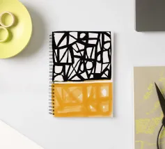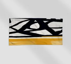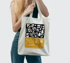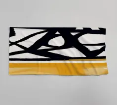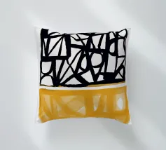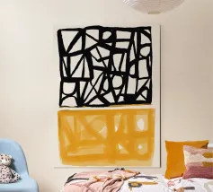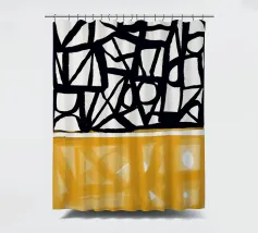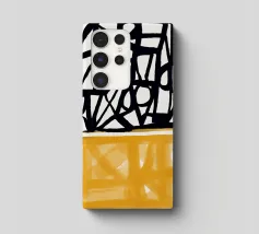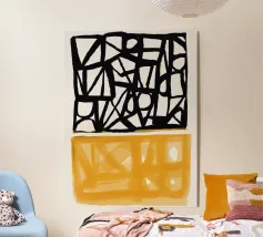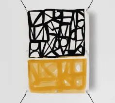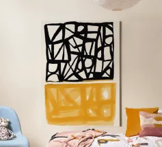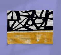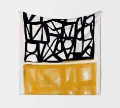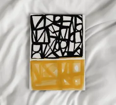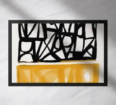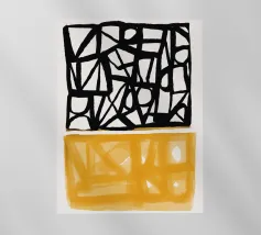 Audaci motivi geometrici in nero e giallo creano un contrasto sorprendente, con forme angolari che si intersecano in vari angoli. La composizione è divisa in due sezioni distinte, una con linee nere e dense e l'altra con tonalità gialle più morbide.