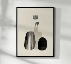 Un'opera d'arte astratta di ispirazione moderna di metà secolo, caratterizzata da cerchi e rettangoli stratificati nei colori rosso ruggine, nero e beige. Il suo stile nostalgico la rende un pezzo ideale per interni retrò o spazi moderni con un tocco vintage.