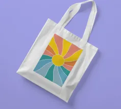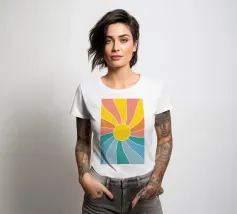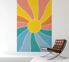 Un motivo radioso e simmetrico con un centro giallo solare da cui partono raggi curvi e ondulati in tonalità calde e fredde: Giallo, pesca, arancio, turchese, azzurro e blu. La disposizione armoniosa e il morbido gradiente di colore creano movimento ed equilibrio allo stesso tempo, come un gioco visivo di luce ed energia.