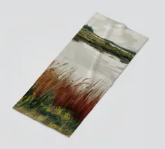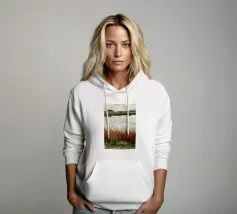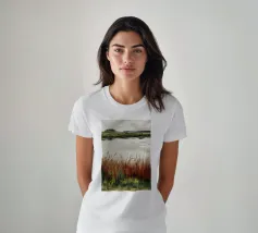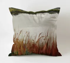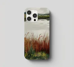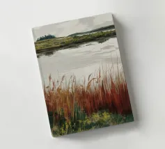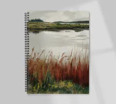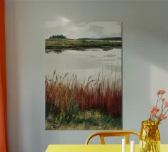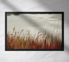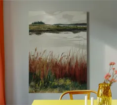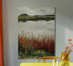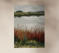 Una tranquilla scena di palude si svolge sotto un cielo calmo e nuvoloso. Canne alte ed erbe dorate si ammassano sull'acqua ferma, con i loro toni marroni e ocra che si riflettono dolcemente sulla superficie. In lontananza, campi verdi e basse colline si fondono in un orizzonte nebbioso. L'atmosfera è quella di una pacifica solitudine e di un silenzio naturale, che cattura la dolce bellezza di un tranquillo paesaggio palustre.