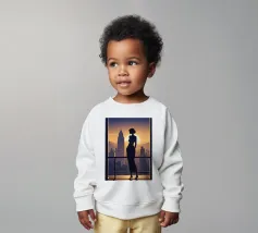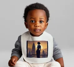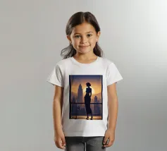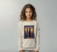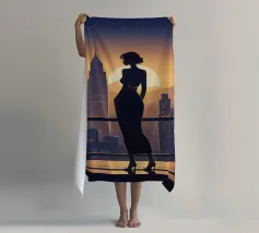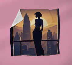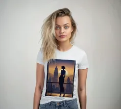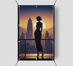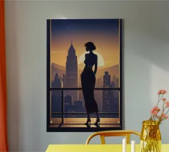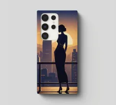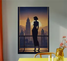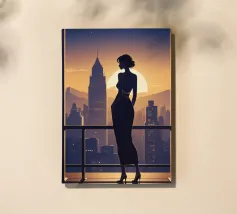 Una graziosa silhouette di donna che si affaccia su uno skyline cittadino luminoso, mentre il sole tramonta dietro i grattacieli. Il minimalismo elegante incontra la luce soffusa della sera, creando un'atmosfera urbana ma poetica.