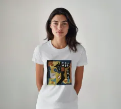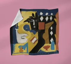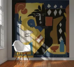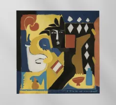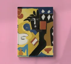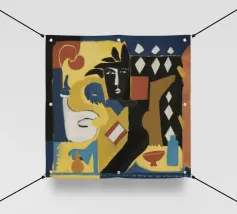 Quest'opera prosegue il motivo tribale con tratti più decisi e un contrasto più ricco. Le figure appaiono in conversazione, incorniciate da drappeggi e oggetti cerimoniali, evocando una memoria ancestrale.