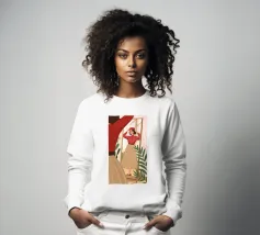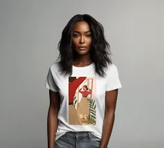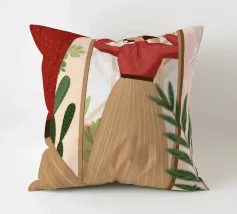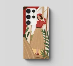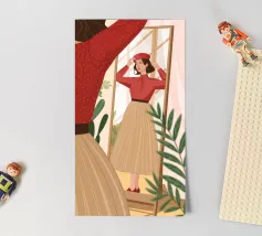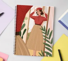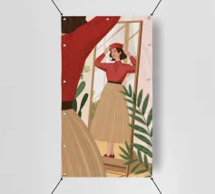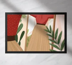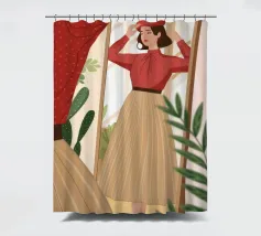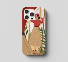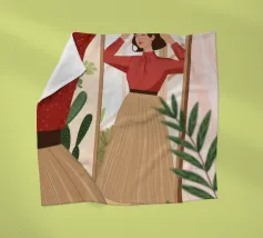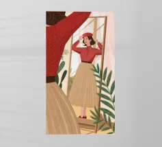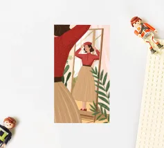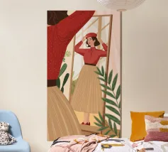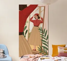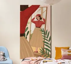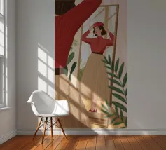 Questo dipinto mostra una persona in piedi davanti a uno specchio che si aggiusta i capelli. La persona indossa un maglione rosso e una gonna beige. Sullo sfondo, piante e una parete rosa tenue creano un'atmosfera serena e riflessiva.