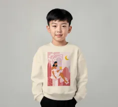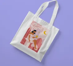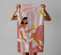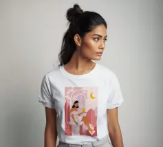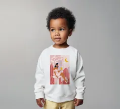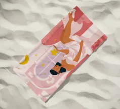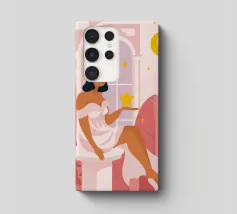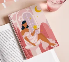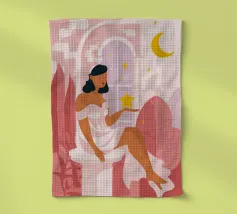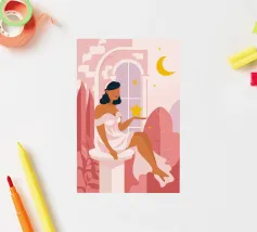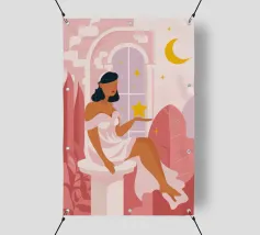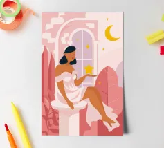 Questa opera d'arte raffigura una persona dalla pelle scura, seduta su un cornicione e intenta a guardare le stelle e la luna nel cielo notturno. Lo sfondo è una miscela di tonalità rosa e viola, che creano una scena sognante e contemplativa.