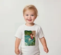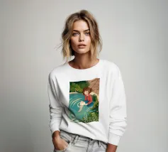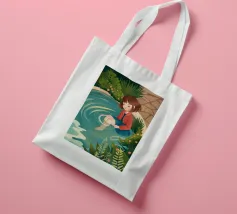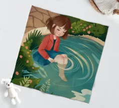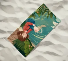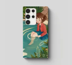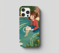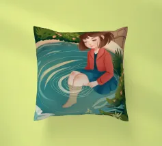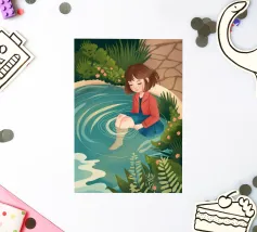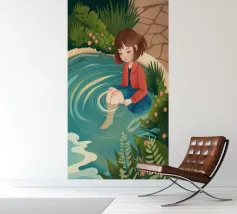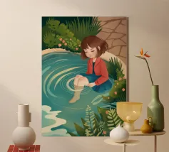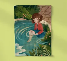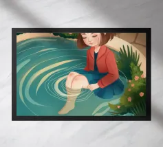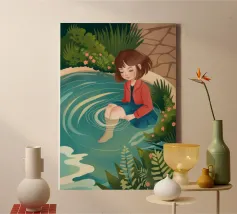 Una persona è seduta vicino a uno stagno, immergendo i piedi nell'acqua mentre legge un libro. Il verde circostante e l'acqua calma creano un ambiente tranquillo.
