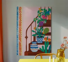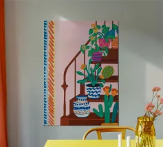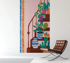 Illustrazione di una scala ornata da numerose piante in vaso, che creano un'oasi interna verde e bohémien, con la luce che filtra, esaltando l'atmosfera tranquilla.