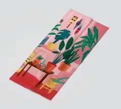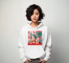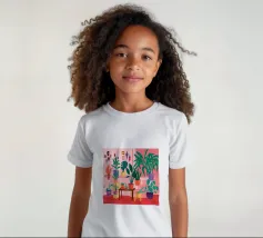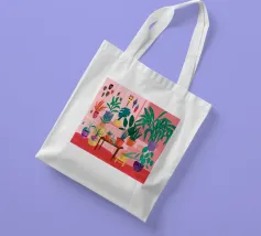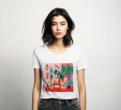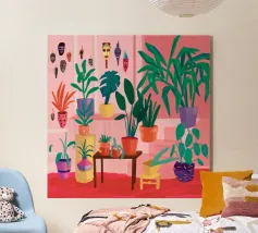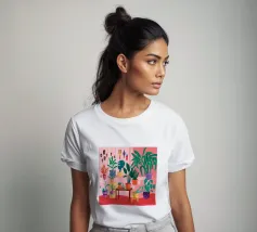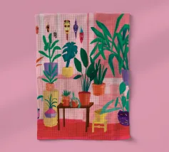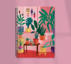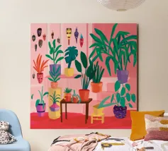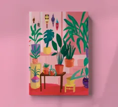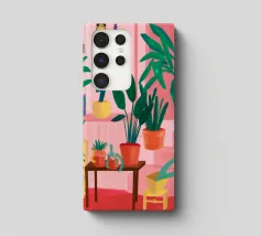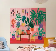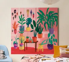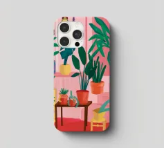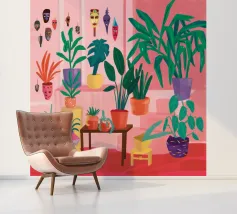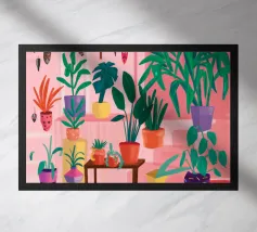 Un'accogliente scena d'interni ritrae una stanza piena di numerose piante in vaso di vario tipo, un tappeto a fantasia e un tavolino, creando un'atmosfera calda, bohémien e amante delle piante con una parete rosa-arancio.