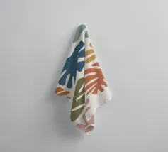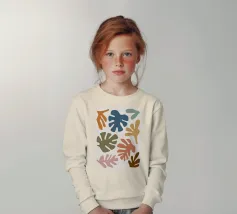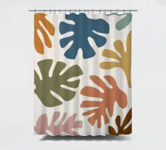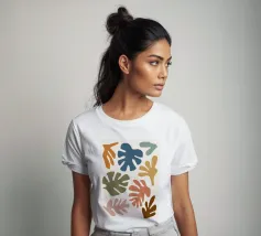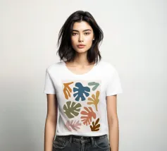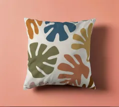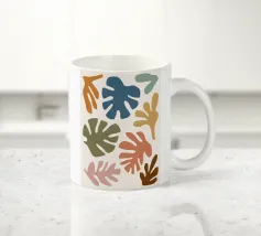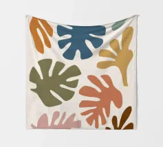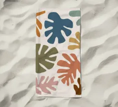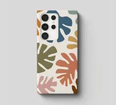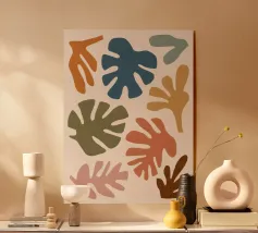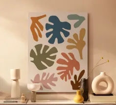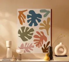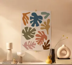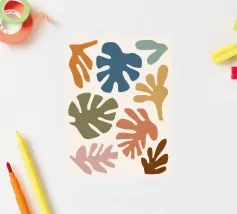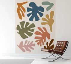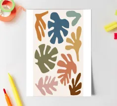 Una collezione di forme botaniche astratte, come foglie di diverse piante, disposte in una tavolozza di colori terrosi, verde, marrone e terracotta, ispirata ai ritagli di Maraoui.