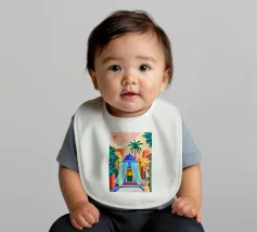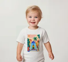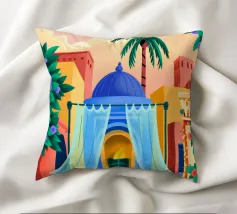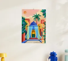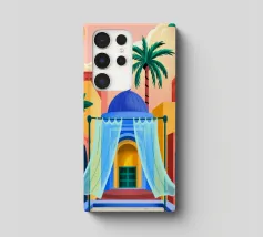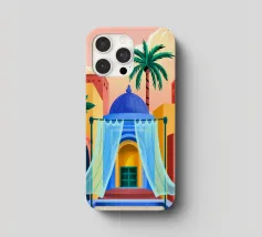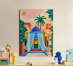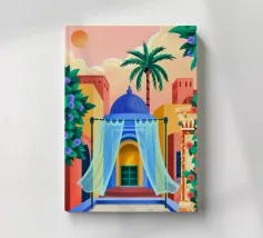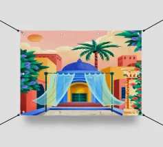 Un cortile con una struttura a cupola blu è ornato da tende fluenti e da una vegetazione lussureggiante. L'atmosfera invitante fonde l'eleganza architettonica con la tranquillità naturale.
