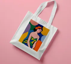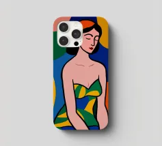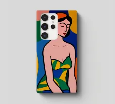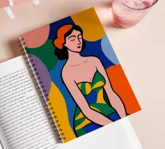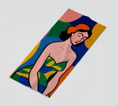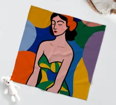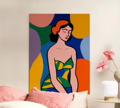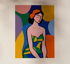 Una donna dai lineamenti sereni e dagli occhi chiusi è raffigurata con colori piatti e decisi e indossa un abito a fantasia. Lo sfondo è composto da grandi forme astratte colorate che esaltano l'atmosfera moderna e vibrante.