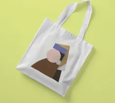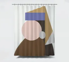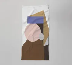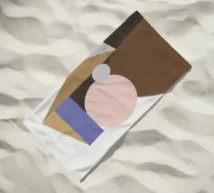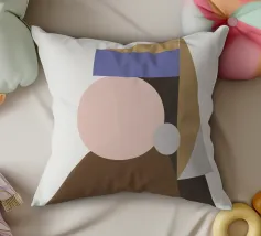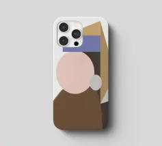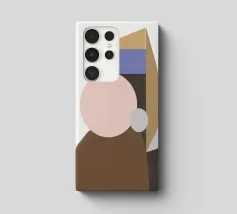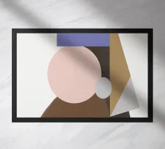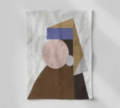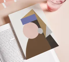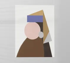Una composizione geometrica presenta una serie di forme colorate e sovrapposte che sembrano formare un ritratto astratto. Cerchi e triangoli nei toni tenui del marrone, del blu e del beige creano un design minimalista.