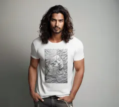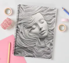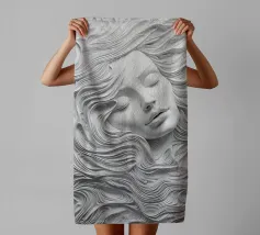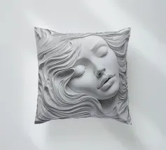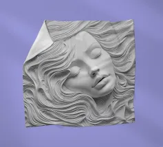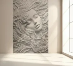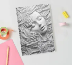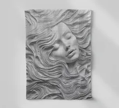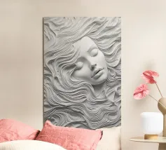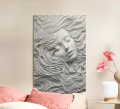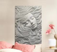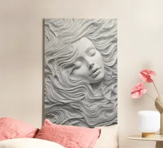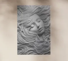 Questo capolavoro scultoreo fonde l'arte marmorea del Bernini con la perfezione digitale. Il volto pacifico emerge dalle onde vorticose dei capelli, un'interpretazione moderna delle dinamiche barocche del movimento. La tavolozza monocromatica esalta l'aura meditativa e ricorda l'arte contemporanea in rilievo 3D. Un pezzo forte per ambienti sofisticati e chiari, che unisce la bellezza classica all'estetica futuristica.