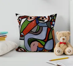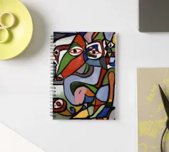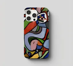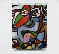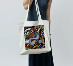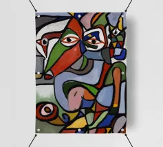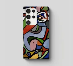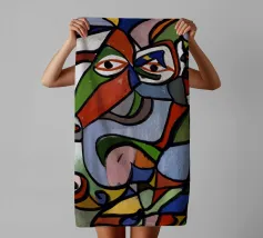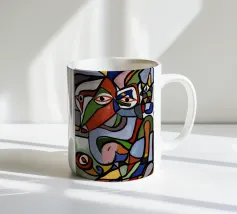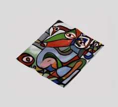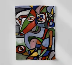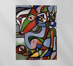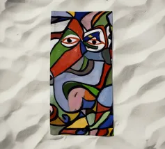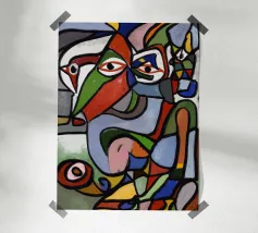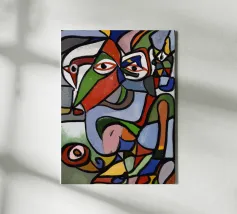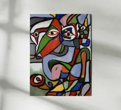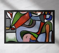 Una vibrante composizione astratta presenta forme e colori che ricordano lo stile cubista. Linee decise definiscono le varie forme geometriche che giocano con un uso sorprendente di tonalità e toni contrastanti.