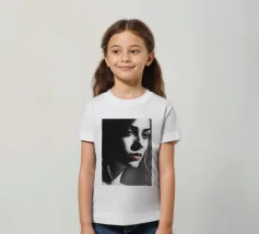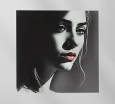 Una giovane donna guarda pensierosa, i suoi lineamenti definiti sono illuminati da una luce delicata. Le ombre morbide creano un contrasto drammatico, mettendo in risalto la sua espressione accattivante.