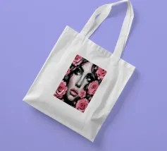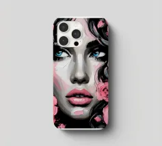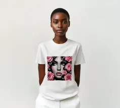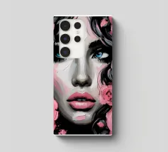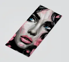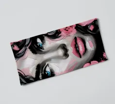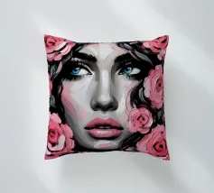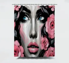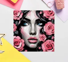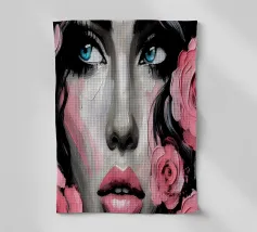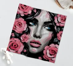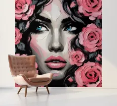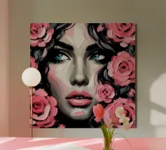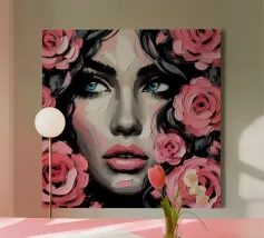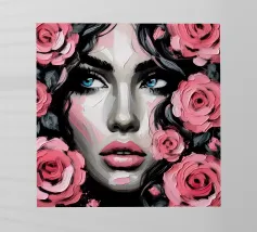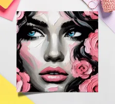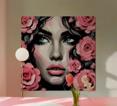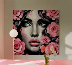 Pittura acrilica di una bella donna con fiori e petali rosa sul viso.
