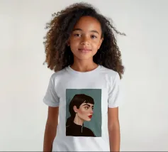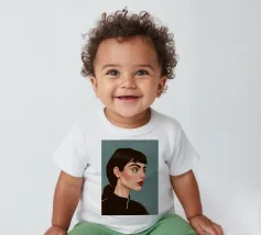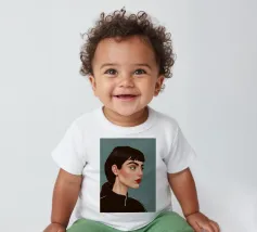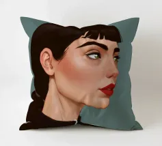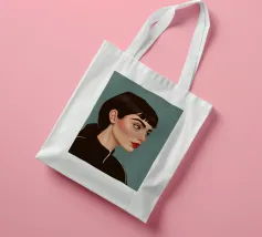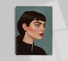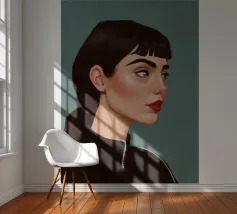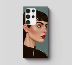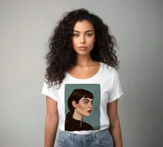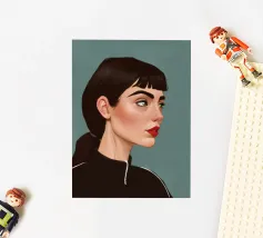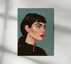 Il ritratto intenso e suggestivo di una donna con capelli scuri, occhi penetranti e un audace rossetto rosso è reso in uno stile pulito, moderno e realistico, che cattura uno sguardo di tranquilla forza e sicurezza.