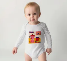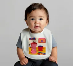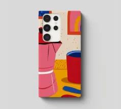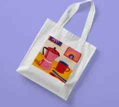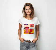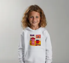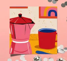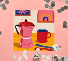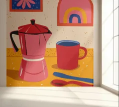 Un'audace illustrazione grafica di una caffettiera rossa e di una tazza rossa abbinata, ambientata in uno spazio cucina minimalista con un accento arcobaleno, che celebra il rito del caffè.